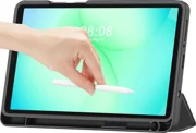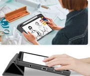 Ein zusätzliches Merkmal der Tasche ist ein spezieller Platz für den Eingabestift, so dass er sicher aufbewahrt und immer in Reichweite bleibt. Die Tasche kann auch als Ständer verwendet werden, um das Tablet in verschiedene Positionen zu bringen - zum Ansehen von Filmen, Lesen oder bequemen Tippen.