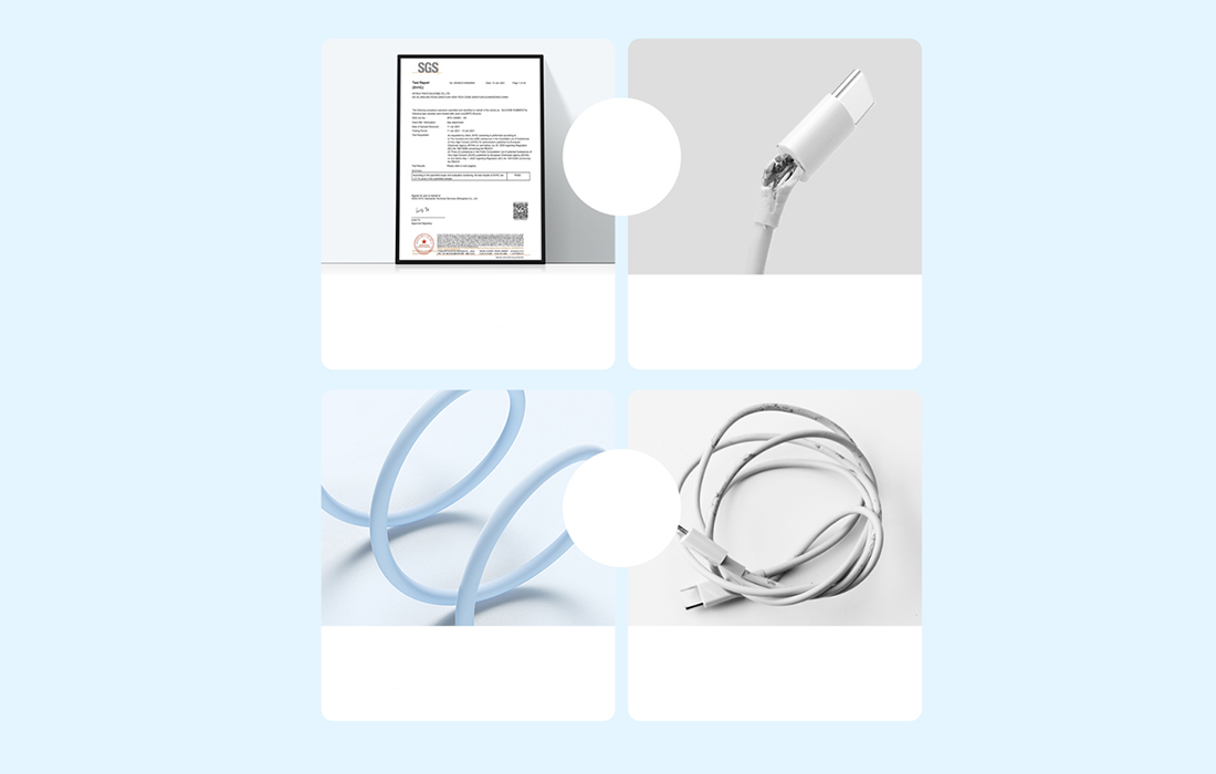 Das Kabel ist mit strapazierfähigem Silikon geschützt, wodurch es viel sicherer ist als ein normales Gummikabel. Das Zubehör ist SGS-zertifiziert, verheddert sich nicht und bricht nicht und ist wischfest. Wer ein Gummikabel besitzt, wird sofort einen riesigen Unterschied bemerken.
