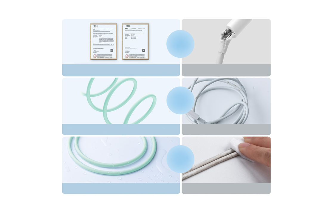 Das Kabel ist mit strapazierfähigem Silikon geschützt, wodurch es viel sicherer ist als ein normales Gummikabel. Das Zubehör ist SGS-zertifiziert, verheddert sich nicht und bricht nicht und ist wischfest. Wer ein Gummikabel besitzt, wird sofort einen riesigen Unterschied bemerken.