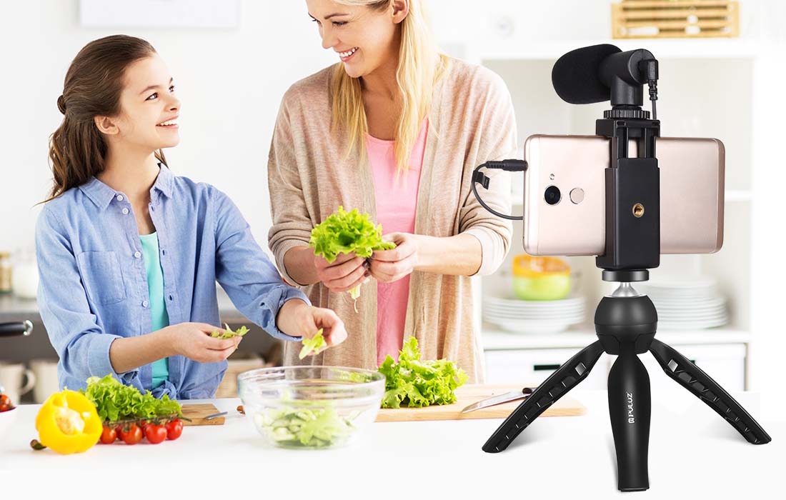 Das Stativ wird mit einem Mikrofon, einem Audiokabel, einem Handykabel, einem Schuh mit doppeltem Telefoneingang, einem Tischständer und einer Aufbewahrungstasche geliefert, die in Kombination mit Ihrem Telefon oder Ihrer Kamera ein gebrauchsfertiges Kit bildet.