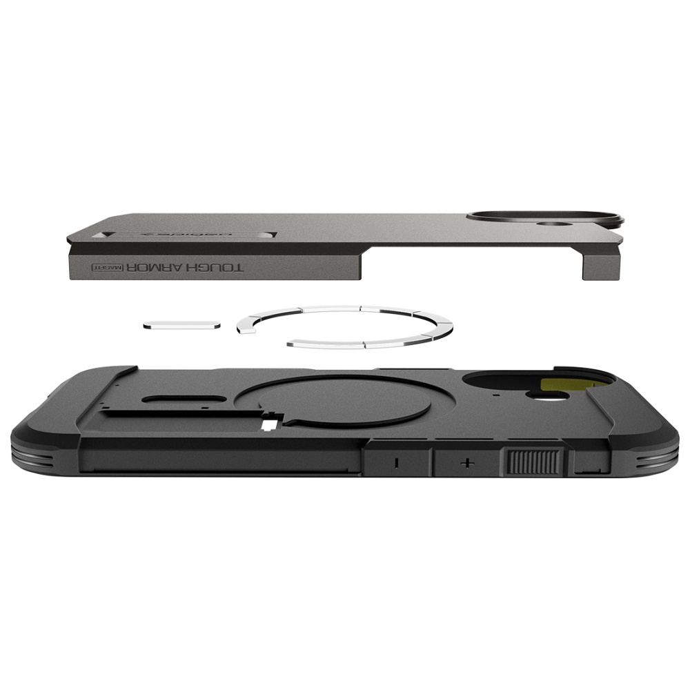 Die Spigen Tough Armor "T" MagSafe-Hülle ist eine der fortschrittlichsten Schutzkonstruktionen im Sortiment der Marke, die mit Blick auf maximale Smartphone-Sicherheit und volle MagSafe-Kompatibilität entwickelt wurde. Dieses Modell verwendet einen dreischichtigen Aufbau, der strapazierfähiges Polycarbonat (PC), flexibles TPU und internen Extreme Protection Foam kombiniert, der Aufprallenergie effektiv absorbiert und ableitet. Dadurch bietet das Gehäuse auch bei Stürzen aus größerer Höhe ein hohes Maß an Schutz.