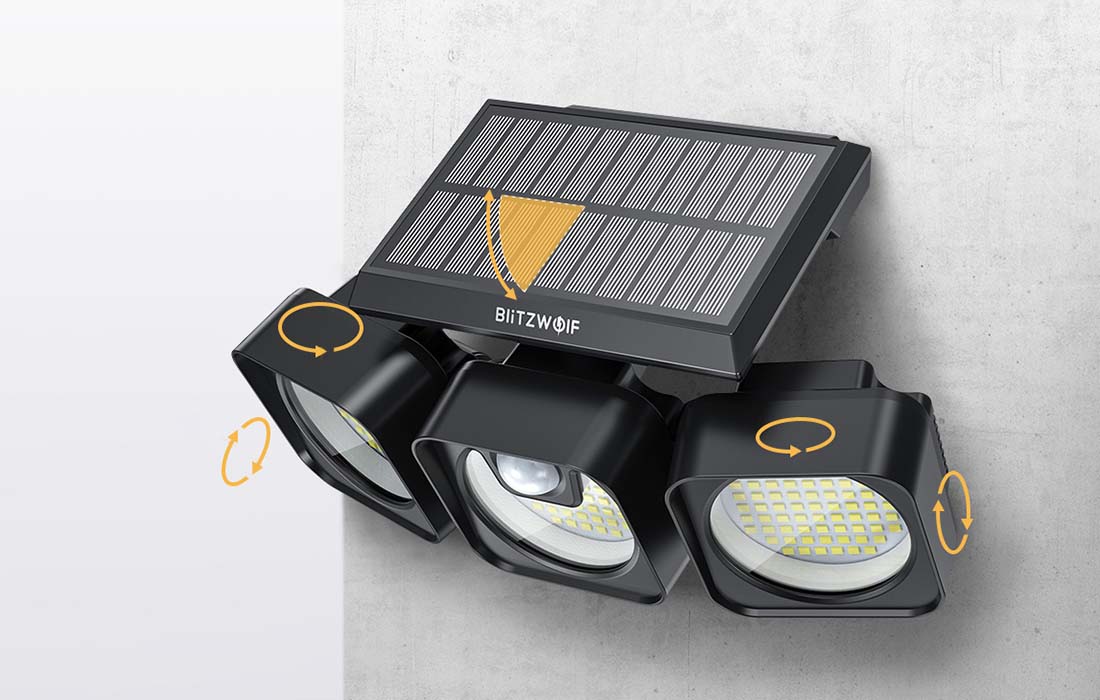Die beiden seitlichen Lampenköpfe können sich horizontal um 90 Grad und vertikal um 360 Grad drehen und bieten so die Möglichkeit, eine Vielzahl von Einstellungen nach Belieben vorzunehmen. Der Sockel der Wandleuchte, auf dem sich das Solarpanel befindet, kann seine Position auch um 60 Grad nach oben oder unten ändern.