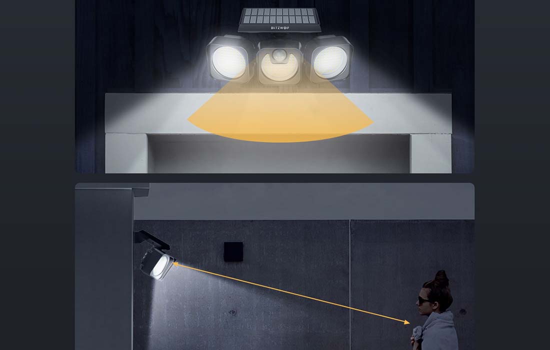 Die Lampe leuchtet automatisch auf, sobald sie eine Bewegung erkennt. Der Sensor befindet sich am Mittelkopf, sein Betriebswinkel beträgt 120 Grad und seine Reichweite beträgt 8 Meter. Die Zeit vom Erkennen einer Bewegung bis zum Einschalten des Lichts beträgt 15 bis 20 Sekunden.