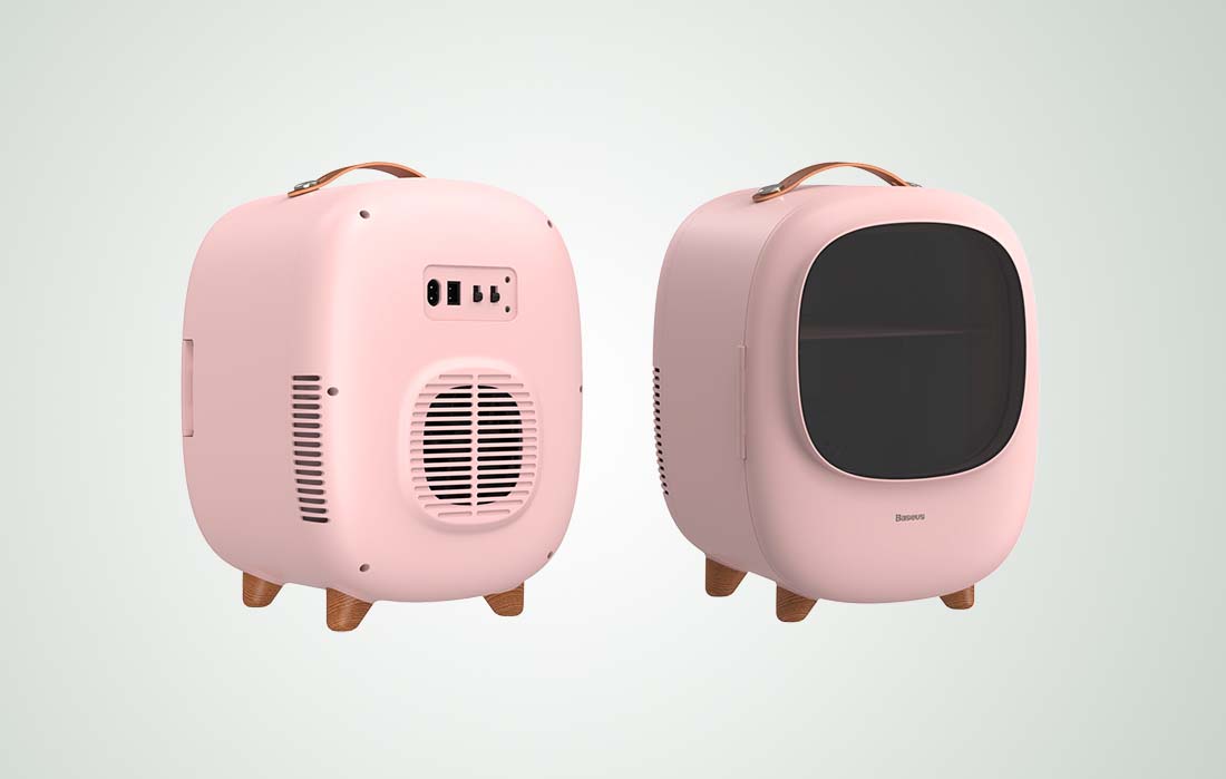 Der Touristenkühlschrank von Baseus sieht sehr stilvoll aus. Die stromlinienförmige Form und die Pastelltöne verleihen ihm einen Chic, und die Details in Form eines Ledergriffs und Holzbeine im japanischen Stil beweisen, dass sich der Hersteller um jedes Detail gekümmert hat. Die Kühlschranktür wurde mit einem Glas ausgestattet, sodass Sie den Inhalt regelmäßig überprüfen können, ohne ihn zu öffnen.
