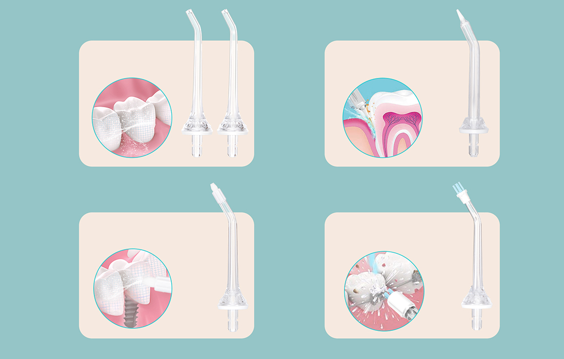 Das Set enthält 4 Arten von Spüldüsen. Die 2 Standarddüsen sind perfekt für den täglichen Gebrauch und sorgen für eine effektive Zahnreinigung. Tragen Sie eine Zahnspange? Die kieferorthopädische Düse ist perfekt für Sie! Die Plaque-Düse ist unersetzlich bei Kronen, Brücken und Implantaten. Haben Sie mit Zahnfleischerkrankungen zu kämpfen? Versuchen Sie es mit einem Parodontal-Handstück, das eine sanfte Massage bietet, die Durchblutung verbessert und Entzündungen lindert.