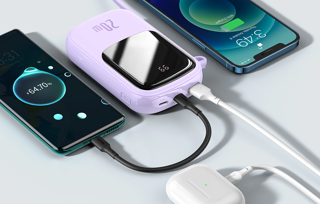 Die Powerbank unterstützt gängige Schnellladeprotokolle wie PD, QC, AFC und SCP. Mit seiner Hilfe können Sie beispielsweise bis zu 50% Ihrer iPhone 12-Serie oder ausgewählte Huawei-Smartphone-Modelle in 30 Minuten aufladen. Das Produkt ist mit 2 Eingangsanschlüssen (Lightning, USB-C) und 3 Ausgängen (USB, USB-C, Blitzkabel) ausgestattet, sodass es für viele Anwendungen geeignet ist. Mit seiner Hilfe können Sie bis zu 3 Geräte gleichzeitig aufladen!