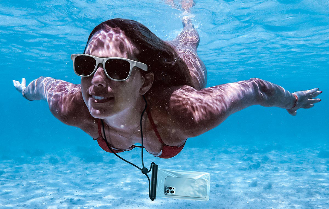 Der Koffer eignet sich perfekt zum Tauchen. Das Produkt hat eine hohe Wasserbeständigkeit und ist außerdem stoßfest. Trotz der 5 Schichten TPU-Material sind Funktionen wie das Entsperren des Telefons oder das Aufnehmen von Bildern immer noch praktisch.